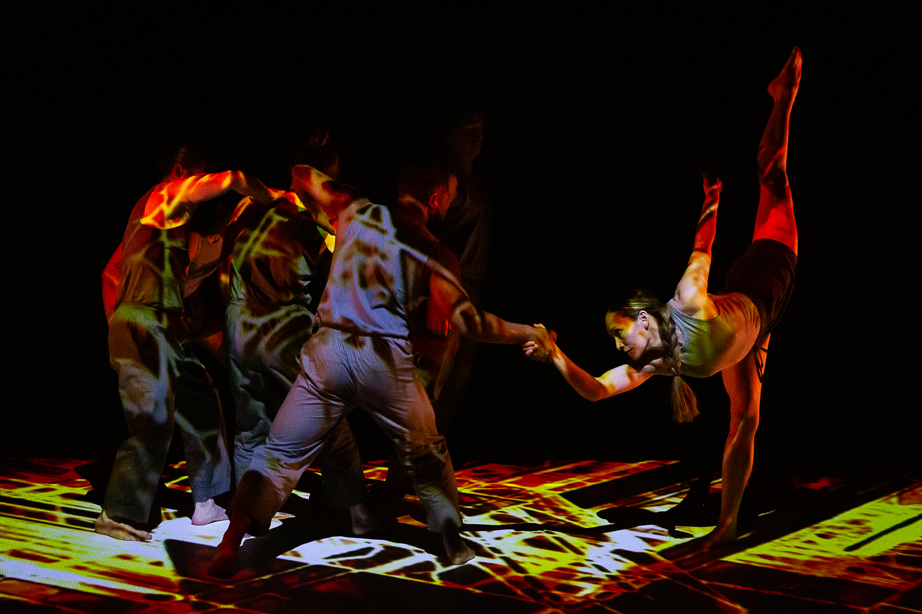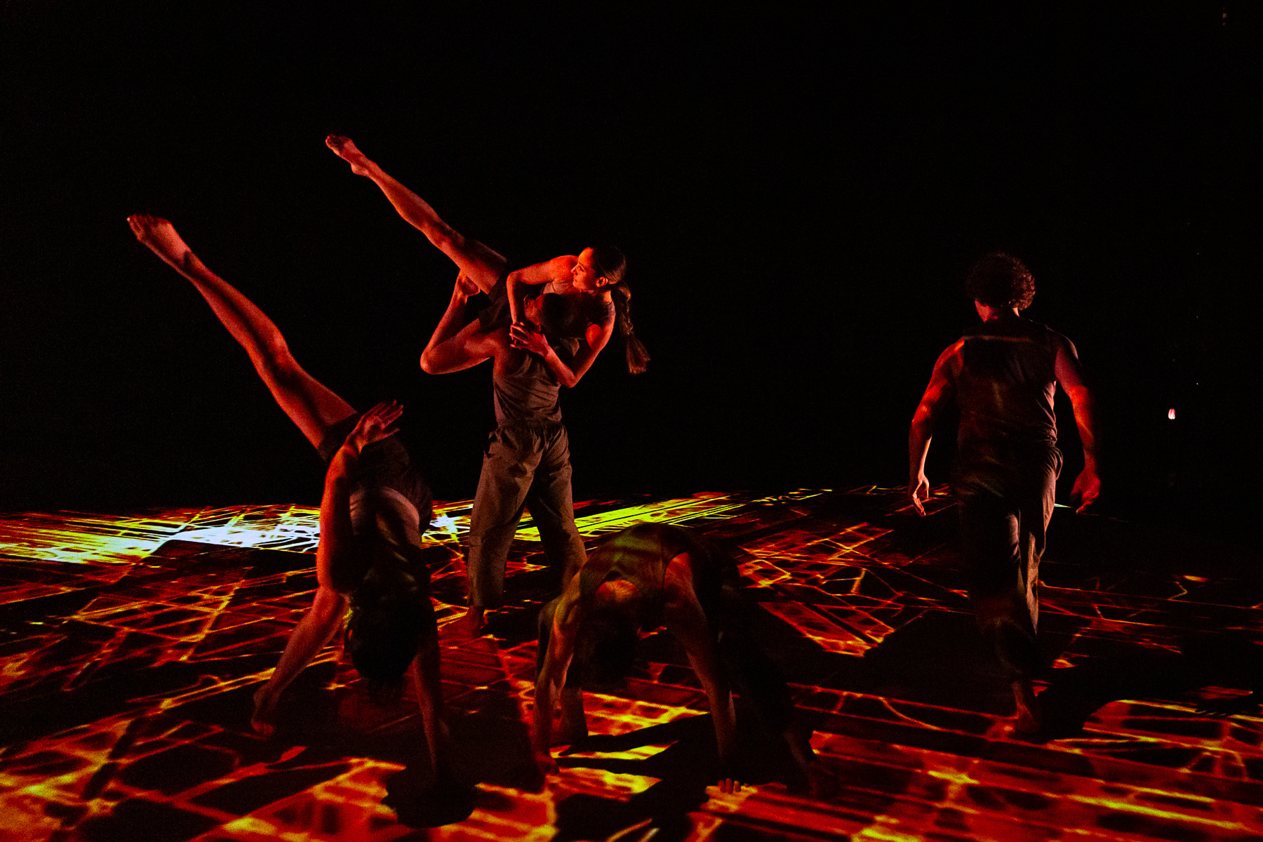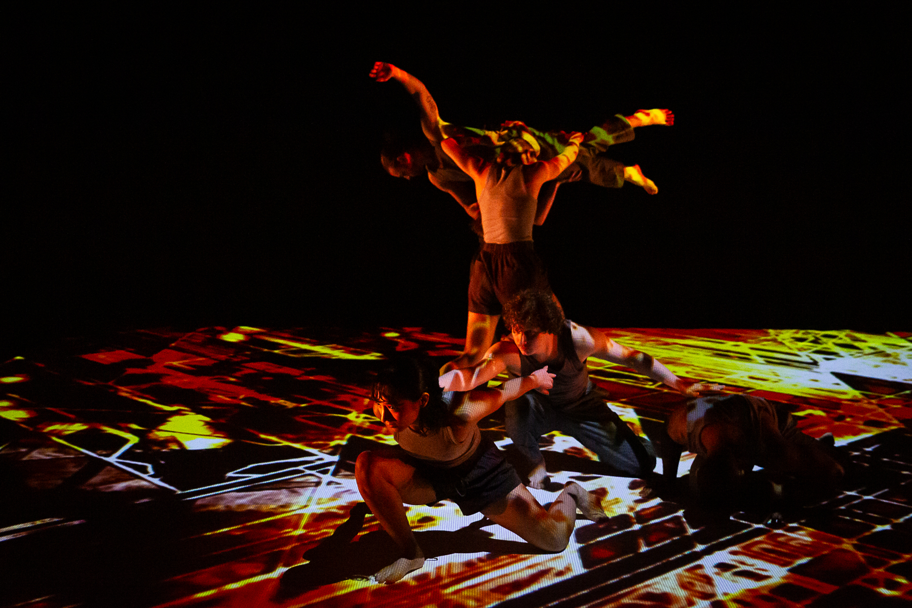 Study No. 1: The Art of Collaboration melds physically daring movement by the Nobles with music and projection design by Badie Khaleghian. The creative process was influenced by the concept of neural synchrony, which refers to the way neurons in the brain fire together in patterns. Immersed in a world of networks and webs, a group of six dancers (Wesley Cordova, LaRodney Freeman, Tyler Orcutt, Jacob Regan, Lauren Serrano, and Angelica Villa), build a community of healthy co-existence. The music blends synthesized and recorded sounds, merging musique concrète with the latest new-age beats sourced from social media reels.