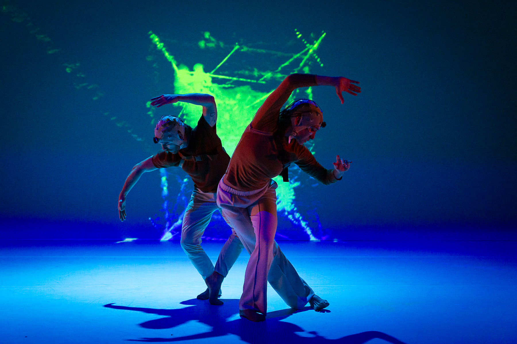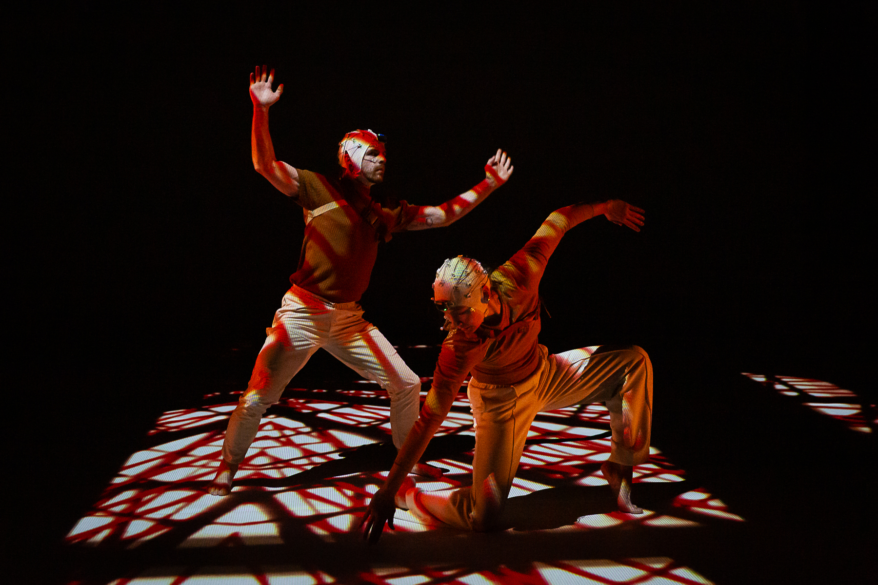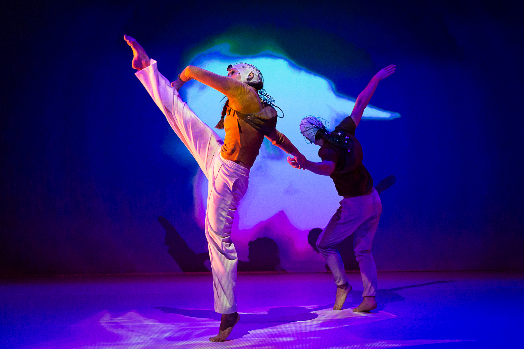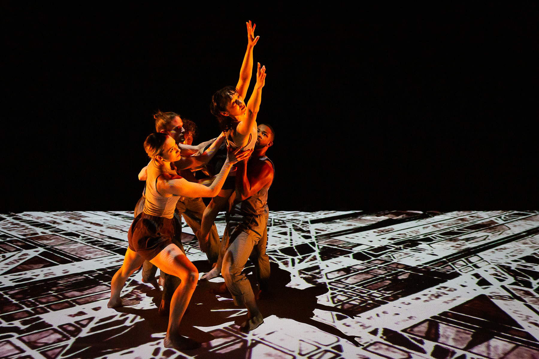 Study No. 1: The Art of Collaboration melds physically daring movement by the Nobles with music and projection design by Badie Khaleghian. The creative process was influenced by the concept of neural synchrony, which refers to the way neurons in the brain fire together in patterns. Immersed in a world of networks and webs, a group of six dancers (Wesley Cordova, LaRodney Freeman, Tyler Orcutt, Jacob Regan, Lauren Serrano, and Angelica Villa), build a community of healthy co-existence. The music blends synthesized and recorded sounds, merging musique concrète with the latest new-age beats sourced from social media reels.