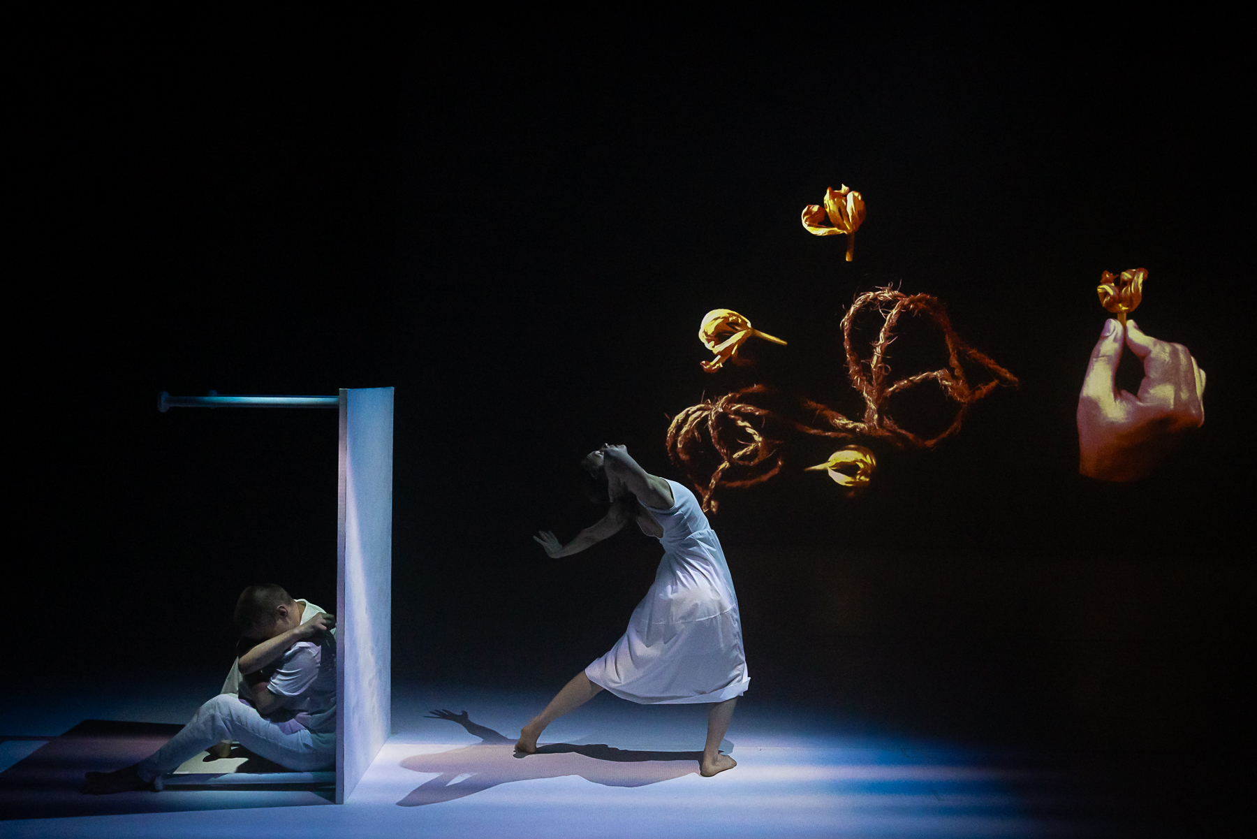Step inside the fractured psyche of Aaron Stands in Phantom Reach, a surreal exploration of consciousness and control. As Aaron drifts through a fugue state, audiences experience his world from both first- and third-person perspectives, with towering projections of his hands revealing the emotional undercurrents he struggles to suppress. These hands become a visual manifestation of inner conflict, desire, and restraint, exposing the tension between thought and action. Featuring evocative multimedia design and composition by Badie Khaleghian, Phantom Reach immerses audiences in a hauntingly beautiful mindscape.